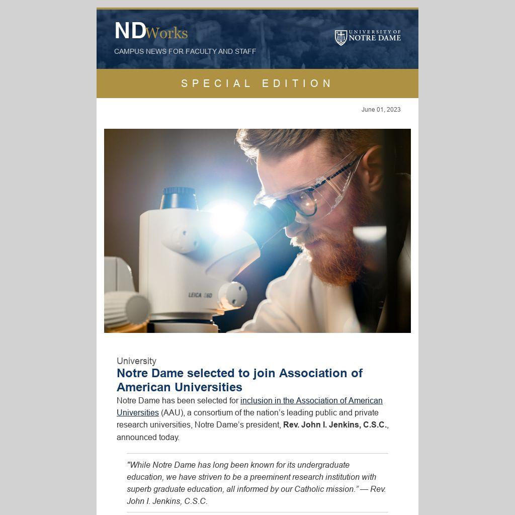 "While Notre Dame has long been known for its undergraduate education, we have striven to be a preeminent research institution with superb graduate education, all informed by our Catholic mission.” — Rev. John I. Jenkins, C.S.C.