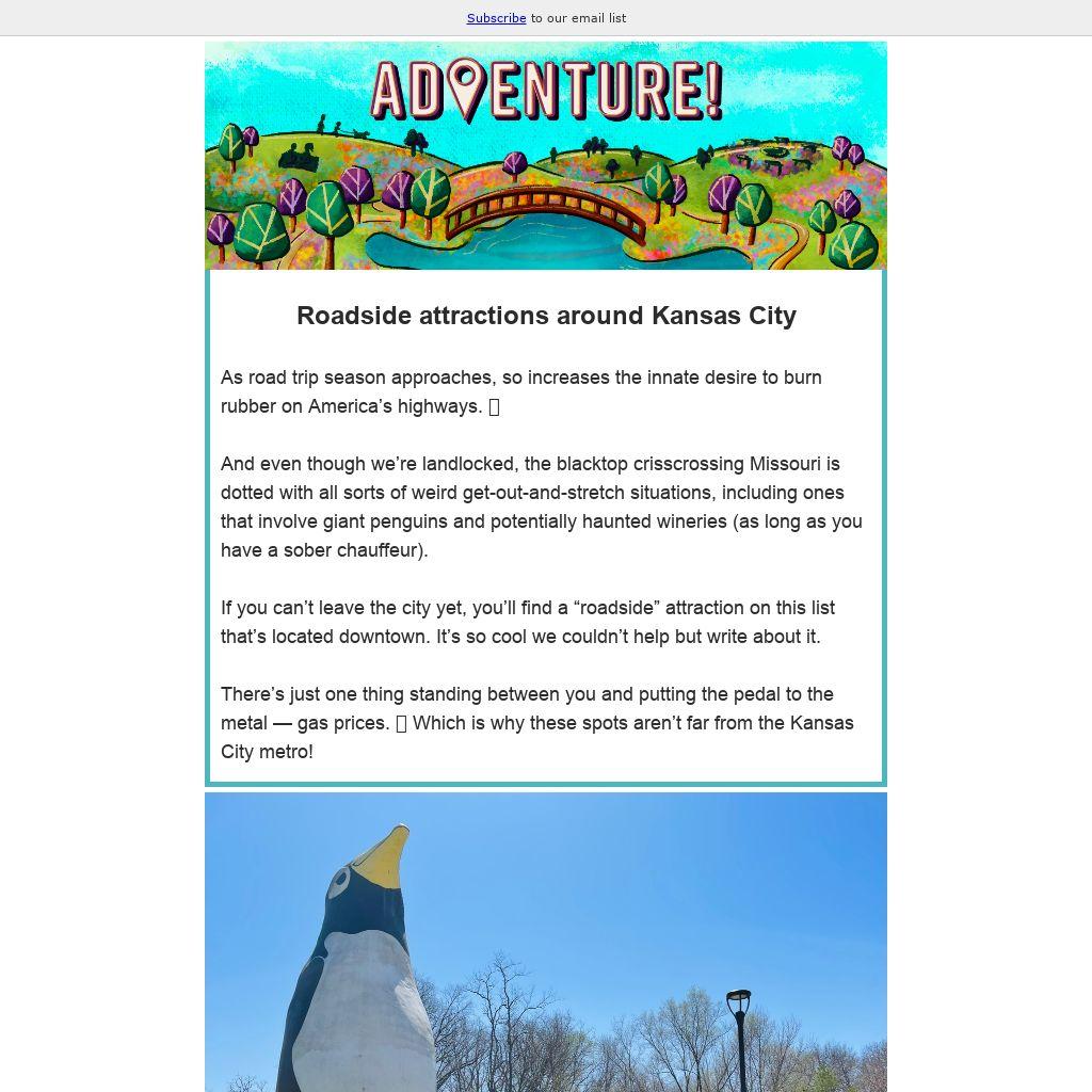 And even though we’re landlocked, the blacktop crisscrossing Missouri is dotted with all sorts of weird get-out-and-stretch situations, including ones that involve giant penguins and potentially haunted wineries (as long as you have a sober chauffeur).