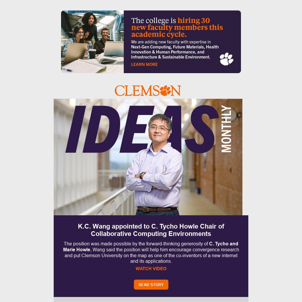As this issue highlights, our new hires will join several recent award-winning colleagues. K.C. Wang has been appointed the new C. Tycho Howle Chair of Collaborative Computing Environments, a position that will help him foster collaborative research and establish Clemson University as one of the co-creators of a new version of the internet which is crucial for supporting next-generation technologies. In addition, Martine LaBerge, chair of the bioengineering department, received the well-deserved Dr. Charles Townes Individual Lifetime Achievement Award from InnoVision. She has been instrumental in creating the leaders and innovators who are the backbone of South Carolina’s life sciences industry. Her colleague, Delphine Dean, was awarded the Governor’s School for Science & Mathematics Randall M. La Cross Distinguished Leadership Award, and Rodrigo Martinez-Duarte, a faculty member in mechanical engineering, won the Hispanic and Latinx Heritage Month Impact Award for his continuous contributions to the Latinx community at Clemson University.