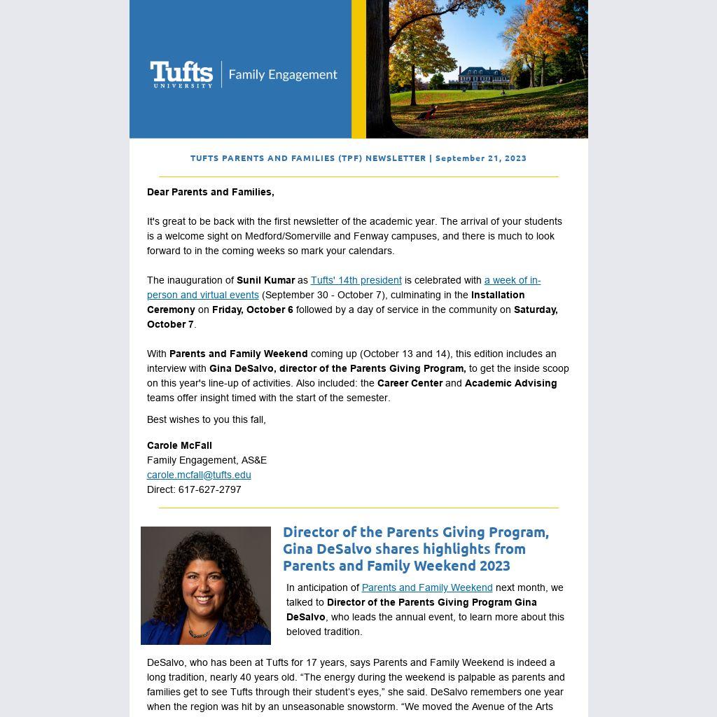 DeSalvo says the Avenue of the Arts and faculty lectures are popular every year and give parents and families a sense of the student experience inside and outside of the classroom. This year, she is excited about Tufts' new president Sunil Kumar giving the welcome address on Saturday morning. “It may be the first time for many parents to hear him speak in person and he has fantastic energy,” she said.