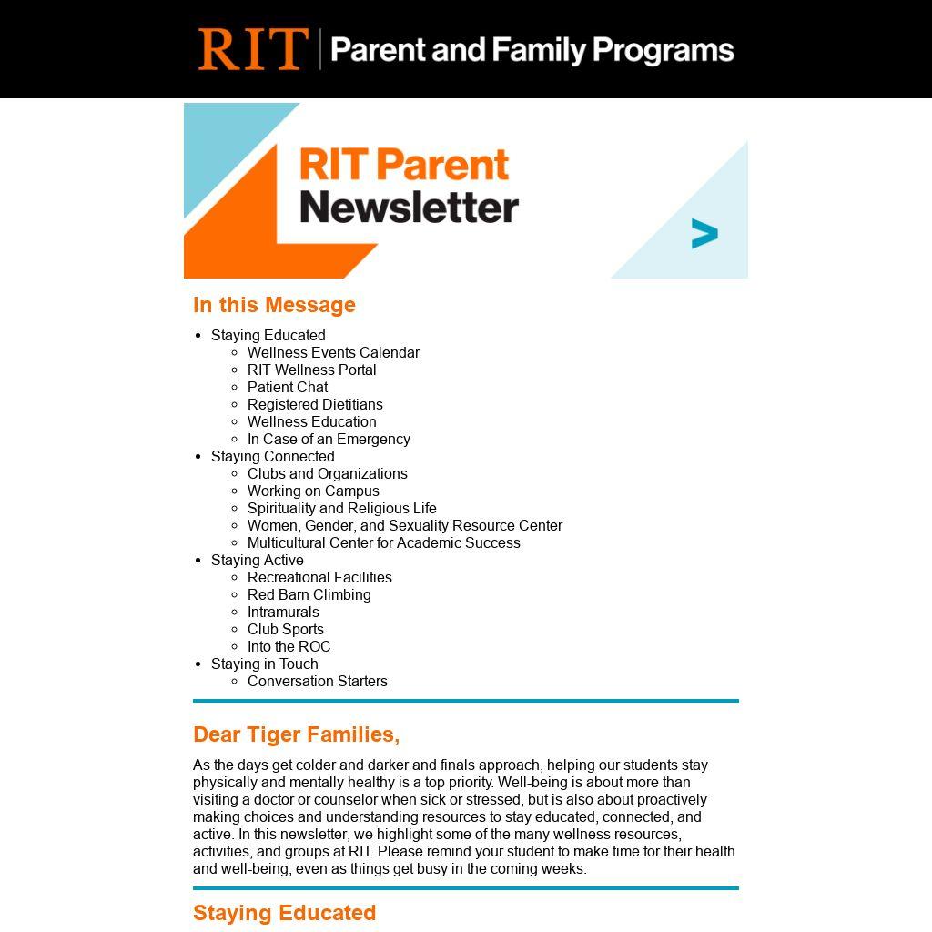 As the days get colder and darker and finals approach, helping our students stay physically and mentally healthy is a top priority. Well-being is about more than visiting a doctor or counselor when sick or stressed, but is also about proactively making choices and understanding resources to stay educated, connected, and active. In this newsletter, we highlight some of the many wellness resources, activities, and groups at RIT. Please remind your student to make time for their health and well-being, even as things get busy in the coming weeks.