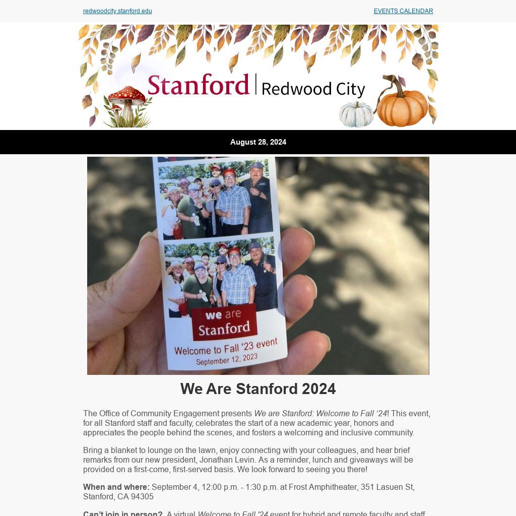 The Office of Community Engagement presents We are Stanford: Welcome to Fall ‘24! This event, for all Stanford staff and faculty, celebrates the start of a new academic year, honors and appreciates the people behind the scenes, and fosters a welcoming and inclusive community.