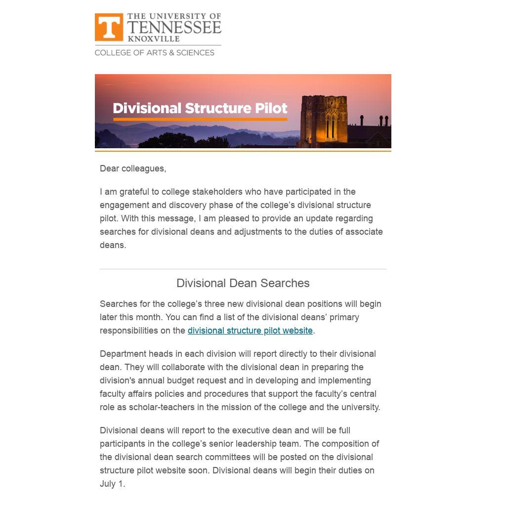 I am grateful to college stakeholders who have participated in the engagement and discovery phase of the college’s divisional structure pilot. With this message, I am pleased to provide an update regarding searches for divisional deans and adjustments to the duties of associate deans.
