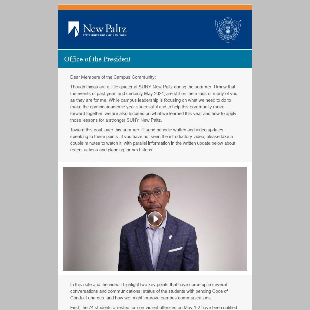 First, the 74 students arrested for non-violent offenses on May 1-2 have been notified that there will be no University Code of Conduct charges for their actions. This does not include one individual who was charged with assault of a State Police investigator.