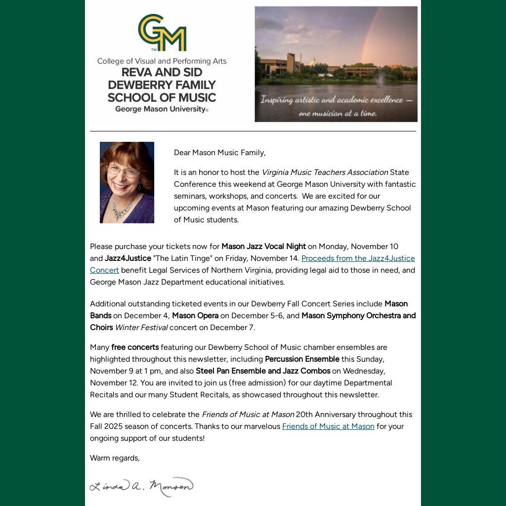 It is an honor to host the Virginia Music Teachers Association State Conference this weekend at George Mason University with fantastic seminars, workshops, and concerts. We are excited for our upcoming events at Mason featuring our amazing Dewberry School of Music students.