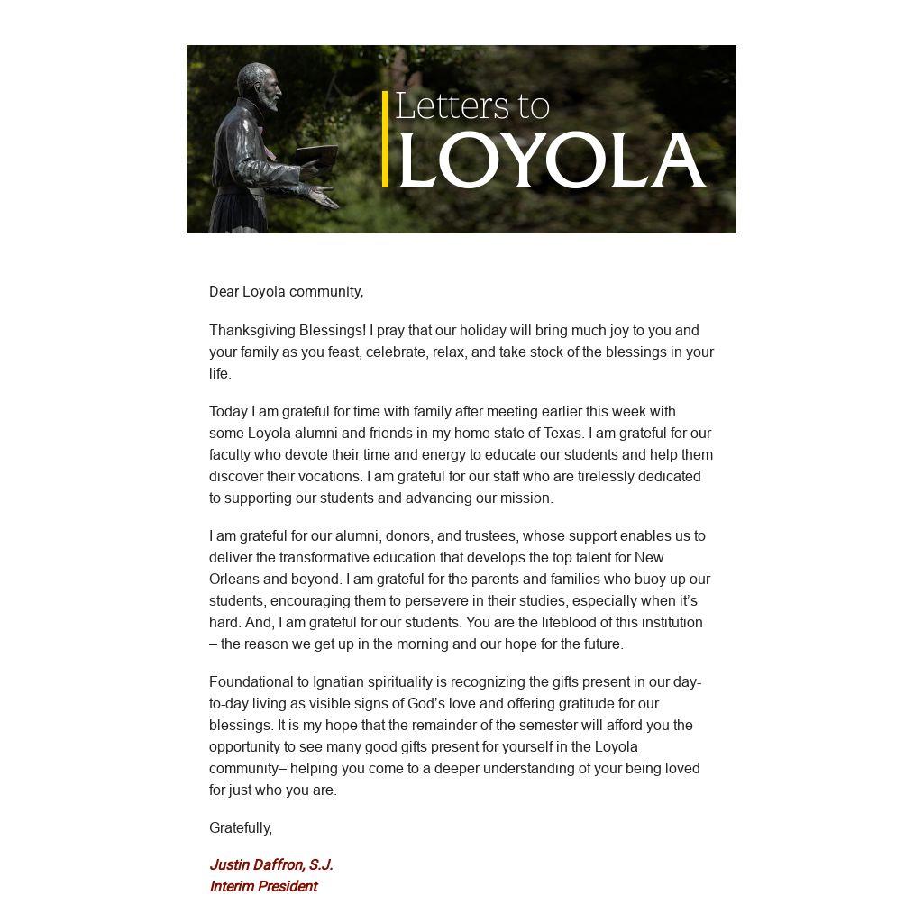 Today I am grateful for time with family after meeting earlier this week with some Loyola alumni and friends in my home state of Texas. I am grateful for our faculty who devote their time and energy to educate our students and help them discover their vocations. I am grateful for our staff who are tirelessly dedicated to supporting our students and advancing our mission.
