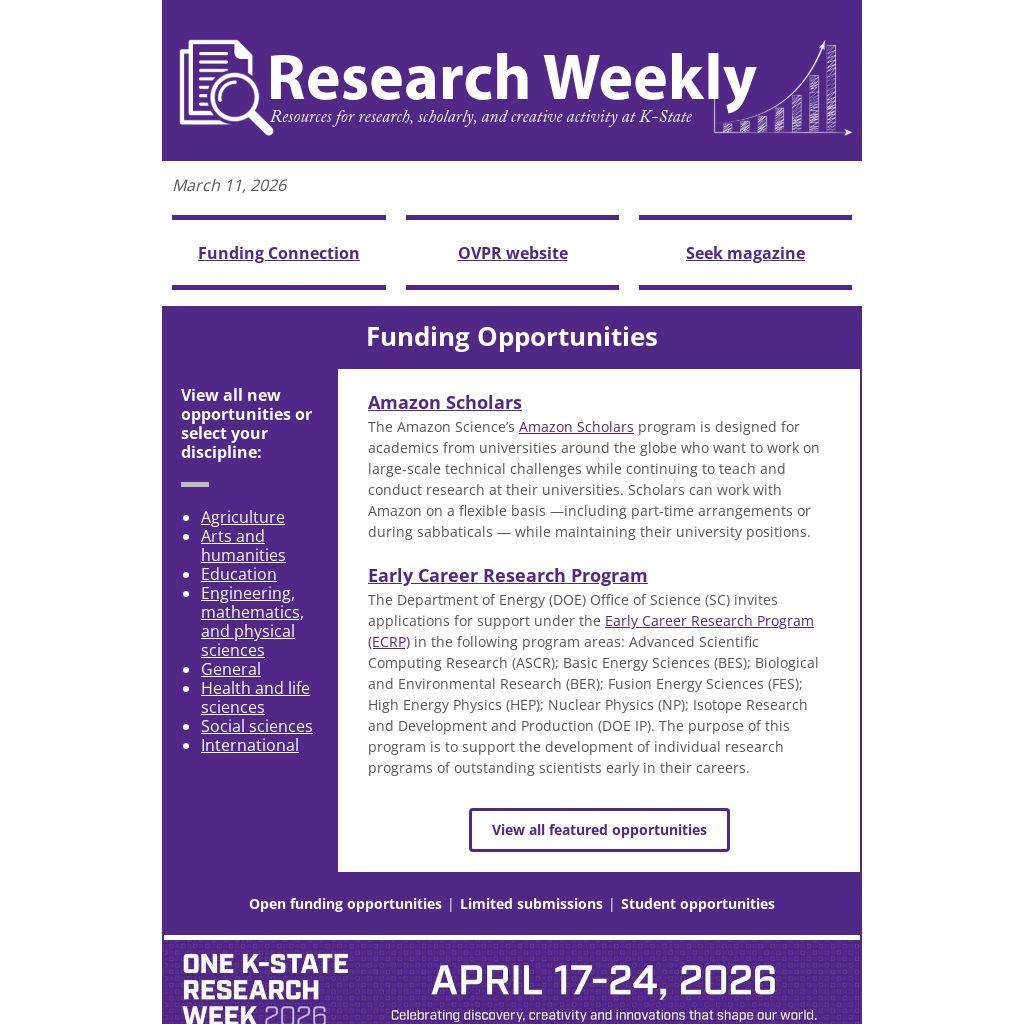 For further information on funding opportunities, limited submissions, teaming, and submission and writing strategies, contact the Office of Research Development team via ord@ksu.edu.