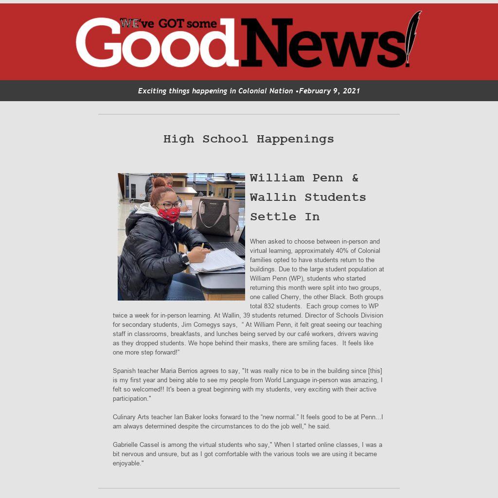When asked to choose between in-person and virtual learning, approximately 40% of Colonial families opted to have students return to the buildings. Due to the large student population at William Penn (WP), students who started returning this month were split into two groups, one called Cherry, the other Black. Both groups total 832 students. Each group comes to WP twice a week for in-person learning. At Wallin, 39 students returned. Director of Schools Division for secondary students, Jim Comegys says, “ At William Penn, it felt great seeing our teaching staff in classrooms, breakfasts, and lunches being served by our café workers, drivers waving as they dropped students. We hope behind their masks, there are smiling faces. It feels like one more step forward!”
