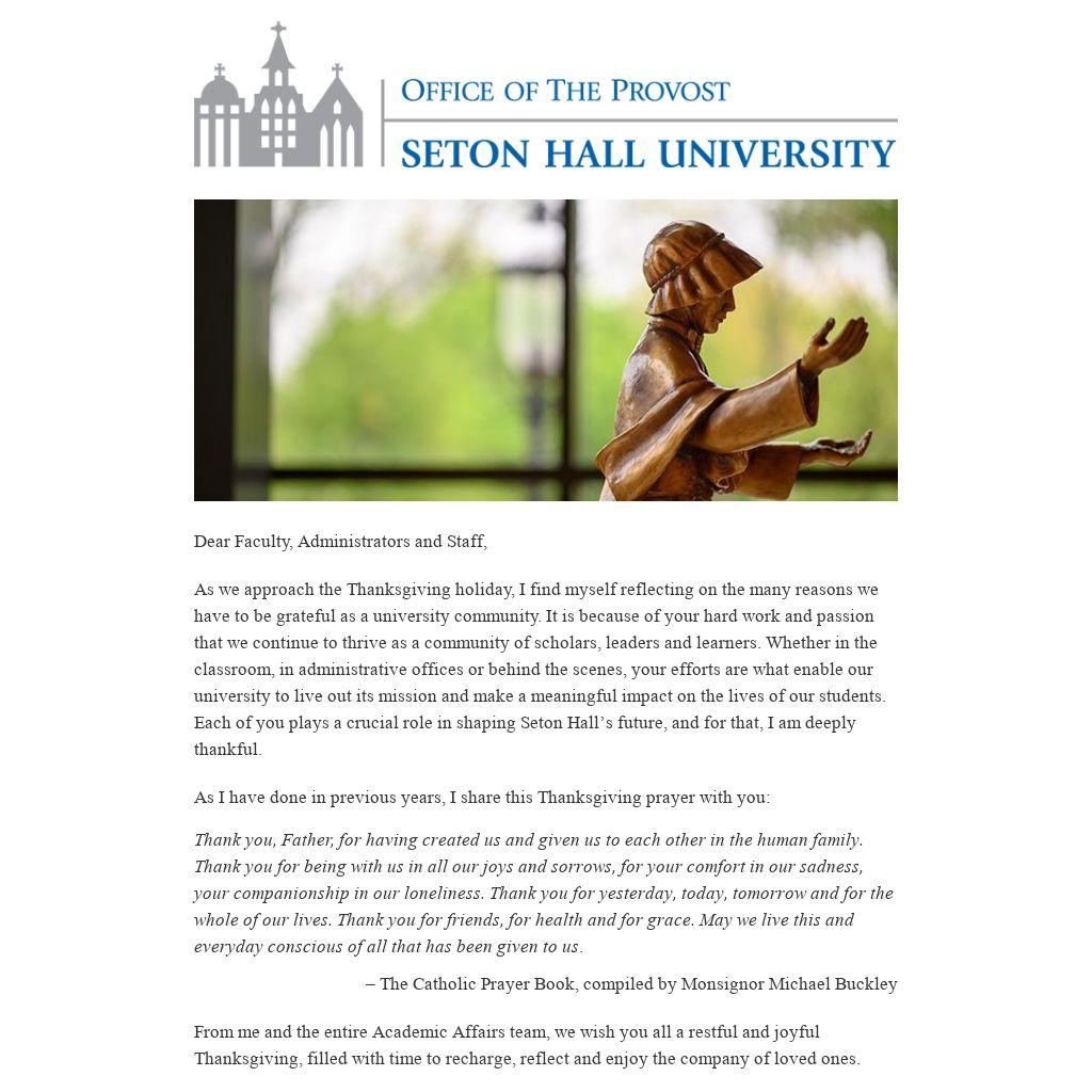 As we approach the Thanksgiving holiday, I find myself reflecting on the many reasons we have to be grateful as a university community. It is because of your hard work and passion that we continue to thrive as a community of scholars, leaders and learners. Whether in the classroom, in administrative offices or behind the scenes, your efforts are what enable our university to live out its mission and make a meaningful impact on the lives of our students. Each of you plays a crucial role in shaping Seton Hall’s future, and for that, I am deeply thankful.