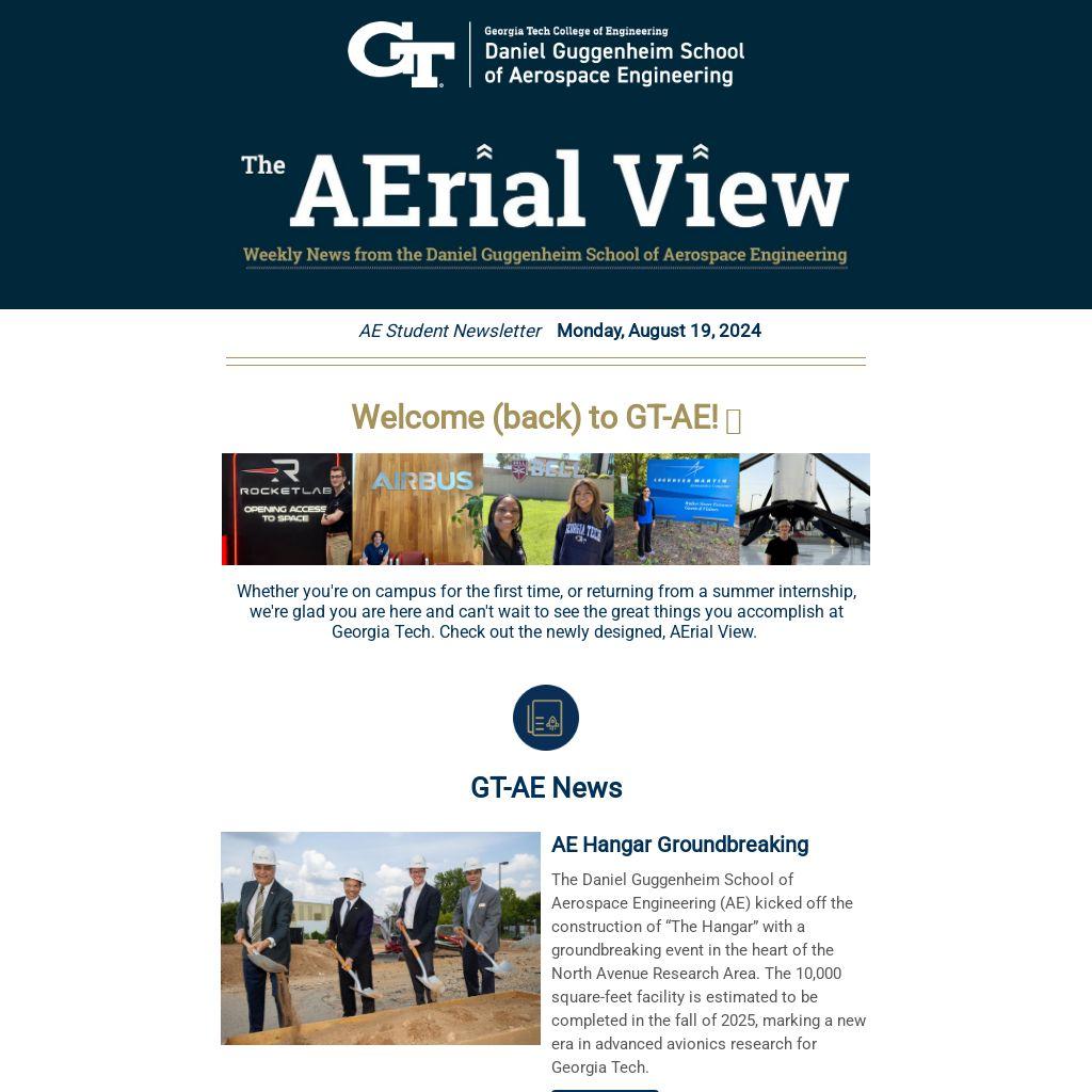 Whether you're on campus for the first time, or returning from a summer internship, we're glad you are here and can't wait to see the great things you accomplish at Georgia Tech. Check out the newly designed, AErial View.Ā