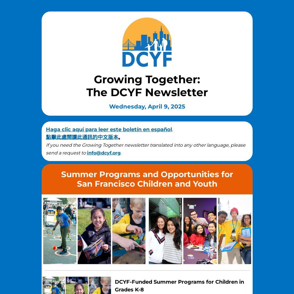 DCYF funds 38 agencies in every San Francisco neighborhood to provide summer programs for children in grades K-8. Visit our Summer Programs for Children and Youth page to find out which agencies we fund, and to access their websites.