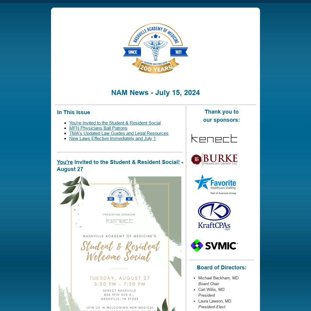 Medical Students and Residents - Do you want to learn how to get involved in organized medicine, from the local to the national level? Or, do you want to know more about the Nashville Academy of Medicine (NAM) and free membership in NAM and TMA for medical students and residents?