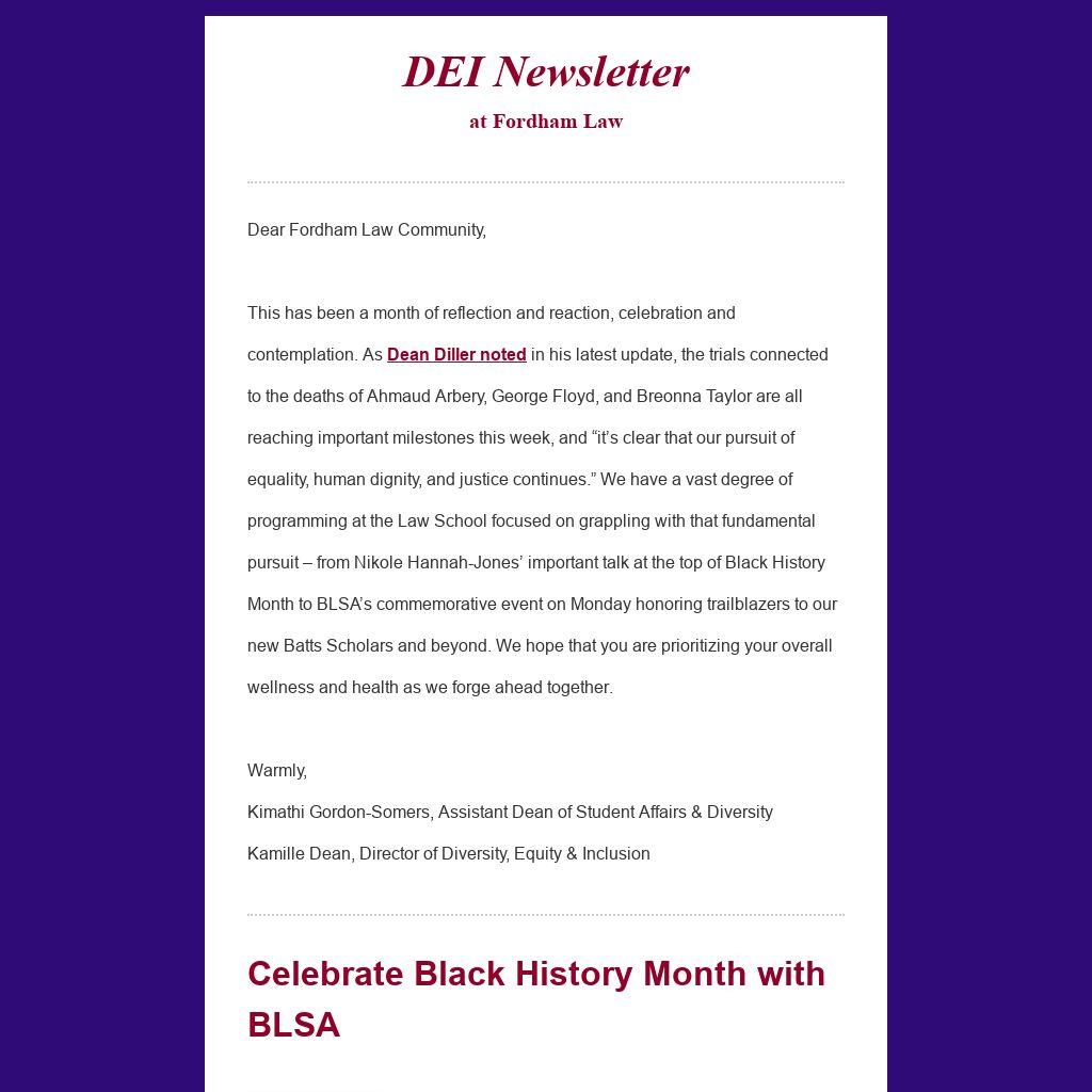 This has been a month of reflection and reaction, celebration and contemplation. As Dean Diller noted in his latest update, the trials connected to the deaths of Ahmaud Arbery, George Floyd, and Breonna Taylor are all reaching important milestones this week, and “it’s clear that our pursuit of equality, human dignity, and justice continues.” We have a vast degree of programming at the Law School focused on grappling with that fundamental pursuit – from Nikole Hannah-Jones’ important talk at the top of Black History Month to BLSA’s commemorative event on Monday honoring trailblazers to our new Batts Scholars and beyond. We hope that you are prioritizing your overall wellness and health as we forge ahead together.