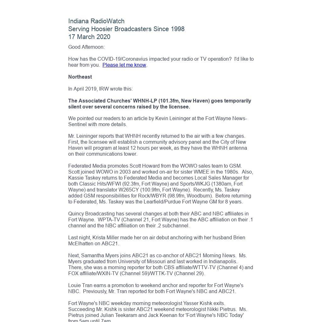 How has the COVID-19/Coronavius impacted your radio or TV operation? I'd like to hear from you. Please let me know.