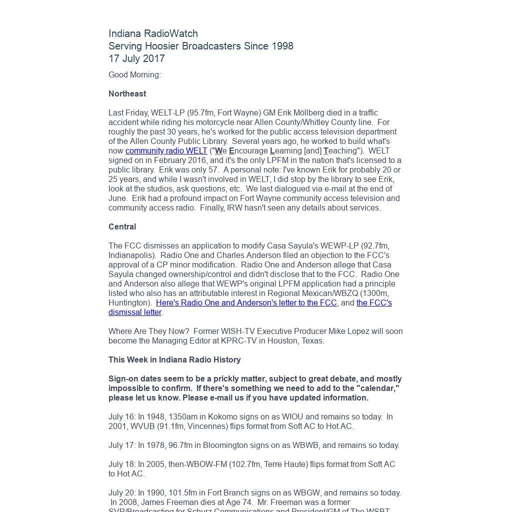 Last Friday, WELT-LP (95.7fm, Fort Wayne) GM Erik Möllberg died in a traffic accident while riding his motorcycle near Allen County/Whitley County line. For roughly the past 30 years, he's worked for the public access television department of the Allen County Public Library. Several years ago, he worked to build what's now community radio WELT ("We Encourage Learning [and] Teaching"). WELT signed on in February 2016, and it's the only LPFM in the nation that's licensed to a public library. Erik was only 57. A personal note: I've known Erik for probably 20 or 25 years, and while I wasn't involved in WELT, I did stop by the library to see Erik, look at the studios, ask questions, etc. We last dialogued via e-mail at the end of June. Erik had a profound impact on Fort Wayne community access television and community access radio. Finally, IRW hasn't seen any details about services.