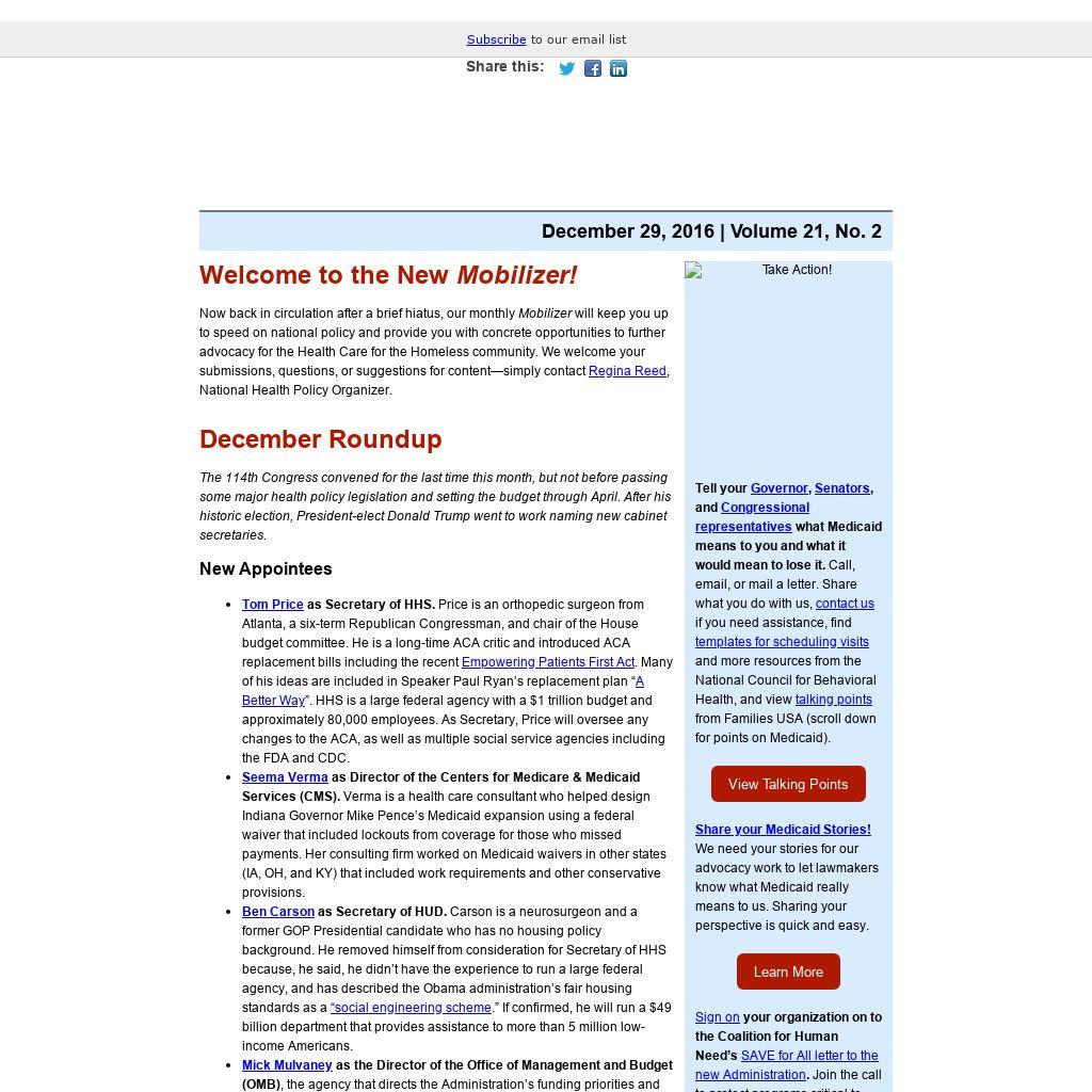 Welcome to the New Mobilizer! Now back in circulation after a brief hiatus, our monthly Mobilizer will keep you up to speed on national policy and provide you with concrete opportunities to further advocacy for the Health Care for the Homeless community. We welcome your submissions, questions, or suggestions for content—simply contact Regina Reed, National Health Policy Organizer.