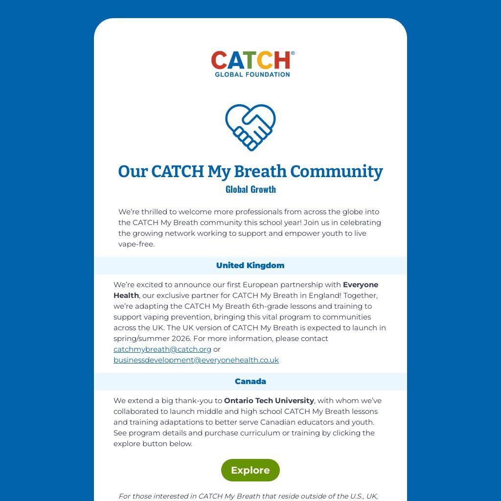 We’re excited to announce our first European partnership with Everyone Health, our exclusive partner for CATCH My Breath in England! Together, we’re adapting the CATCH My Breath 6th-grade lessons and training to support vaping prevention, bringing this vital program to communities across the UK. The UK version of CATCH My Breath is expected to launch in spring/summer 2026. For more information, please contact catchmybreath@catch.org or businessdevelopment@everyonehealth.co.uk
