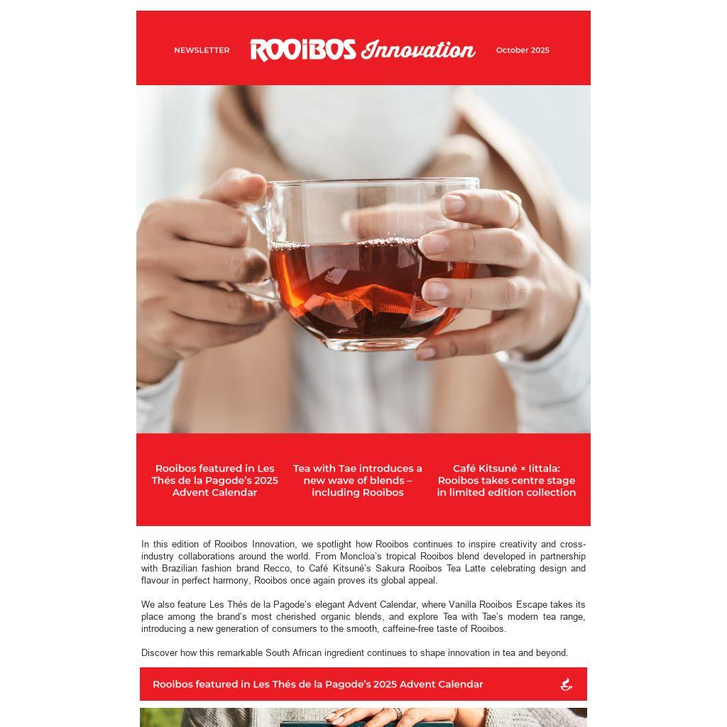 In this edition of Rooibos Innovation, we spotlight how Rooibos continues to inspire creativity and cross-industry collaborations around the world. From Moncloa’s tropical Rooibos blend developed in partnership with Brazilian fashion brand Recco, to Café Kitsuné’s Sakura Rooibos Tea Latte celebrating design and flavour in perfect harmony, Rooibos once again proves its global appeal.