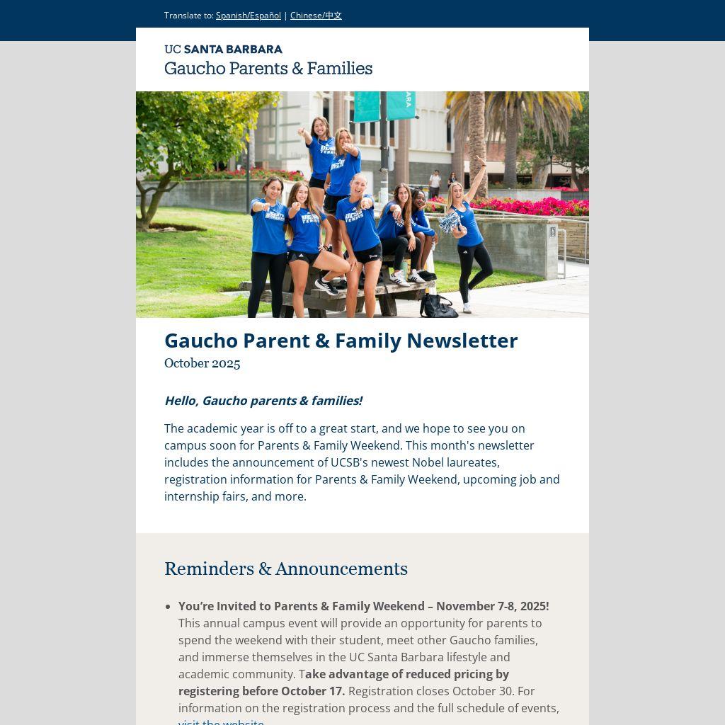 You’re Invited to Parents & Family Weekend – November 7-8, 2025! This annual campus event will provide an opportunity for parents to spend the weekend with their student, meet other Gaucho families, and immerse themselves in the UC Santa Barbara lifestyle and academic community. Take advantage of reduced pricing by registering before October 17. Registration closes October 30. For information on the registration process and the full schedule of events, visit the website.