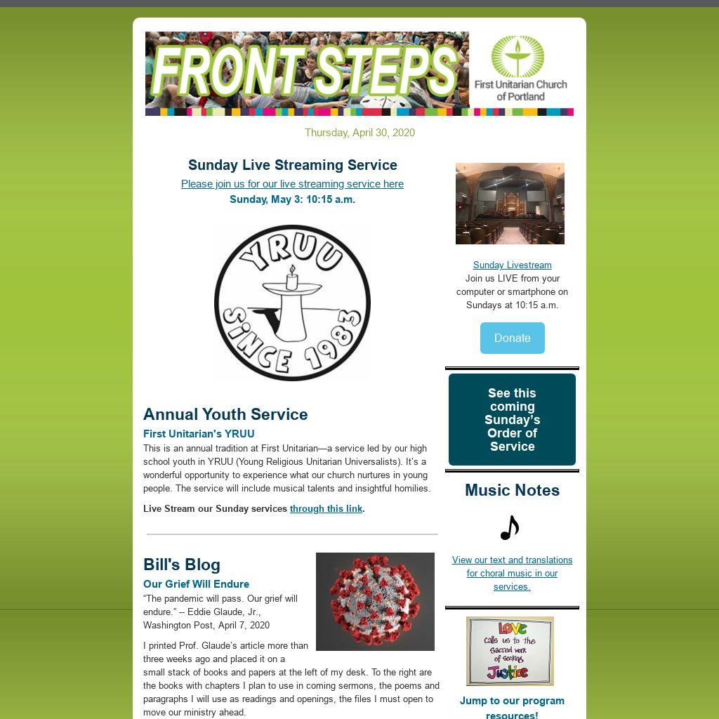If you have an item you’d like published in our weekly Front Steps (eNews) or the Sunday Bulletin, please submit it here and include in the subject line “For eNews” –or– “For Sunday Bulletin” –or– “For eNews and Sunday Bulletin.”