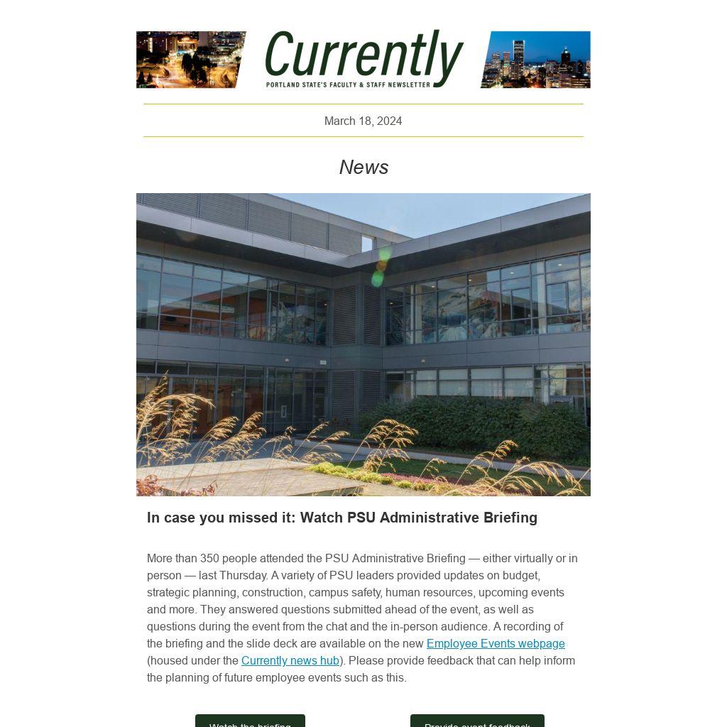 CURRENTLY is a weekly newsletter for the employees of Portland State University, published by University Communications. News items, events and accolades should be sent to currently@pdx.edu. Deadline is noon, the Tuesday before publication. See the Currently website for submission guidelines and schedule.