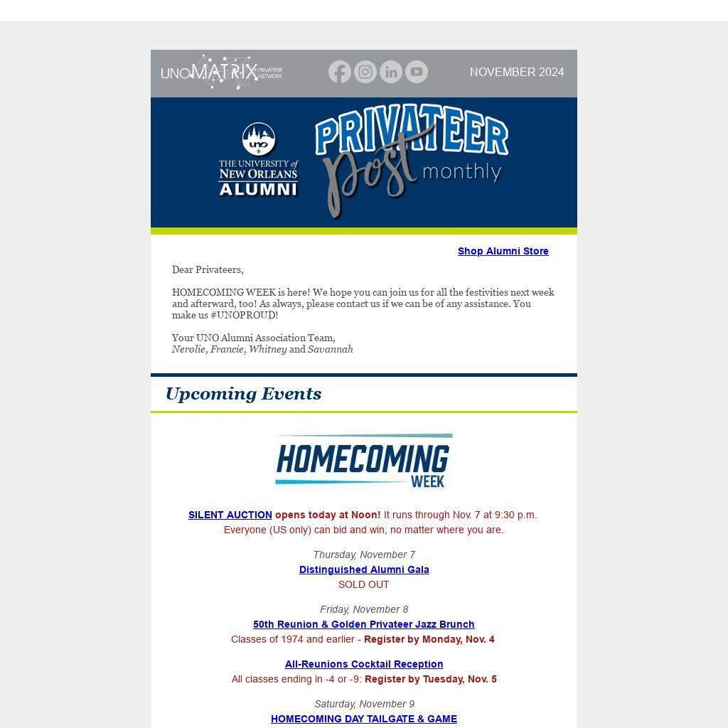 HOMECOMING WEEK is here! We hope you can join us for all the festivities next week and afterward, too! As always, please contact us if we can be of any assistance. You make us #UNOPROUD!