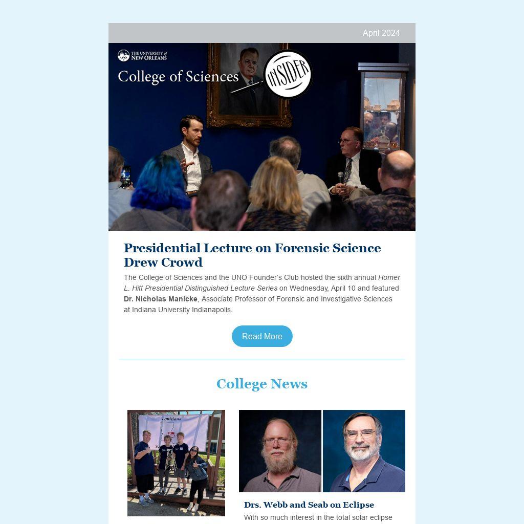 The College of Sciences and the UNO Founder’s Club hosted the sixth annual Homer L. Hitt Presidential Distinguished Lecture Series on Wednesday, April 10 and featured Dr. Nicholas Manicke, Associate Professor of Forensic and Investigative Sciences at Indiana University Indianapolis.