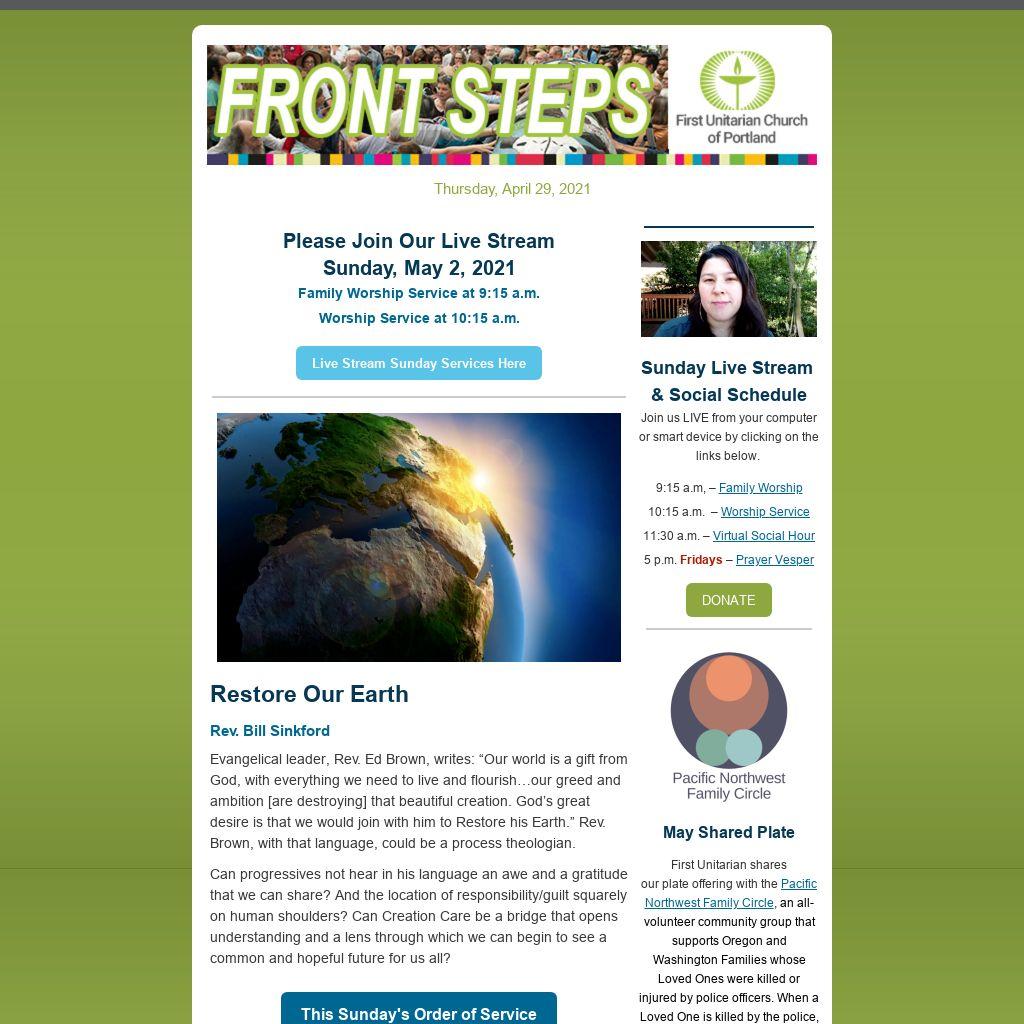 Church Communications: Do you receive messages from the church including this weekly E-News and our Staying Connected emails? To receive church emails send a note to etafuri@firstunitarianportland.org.