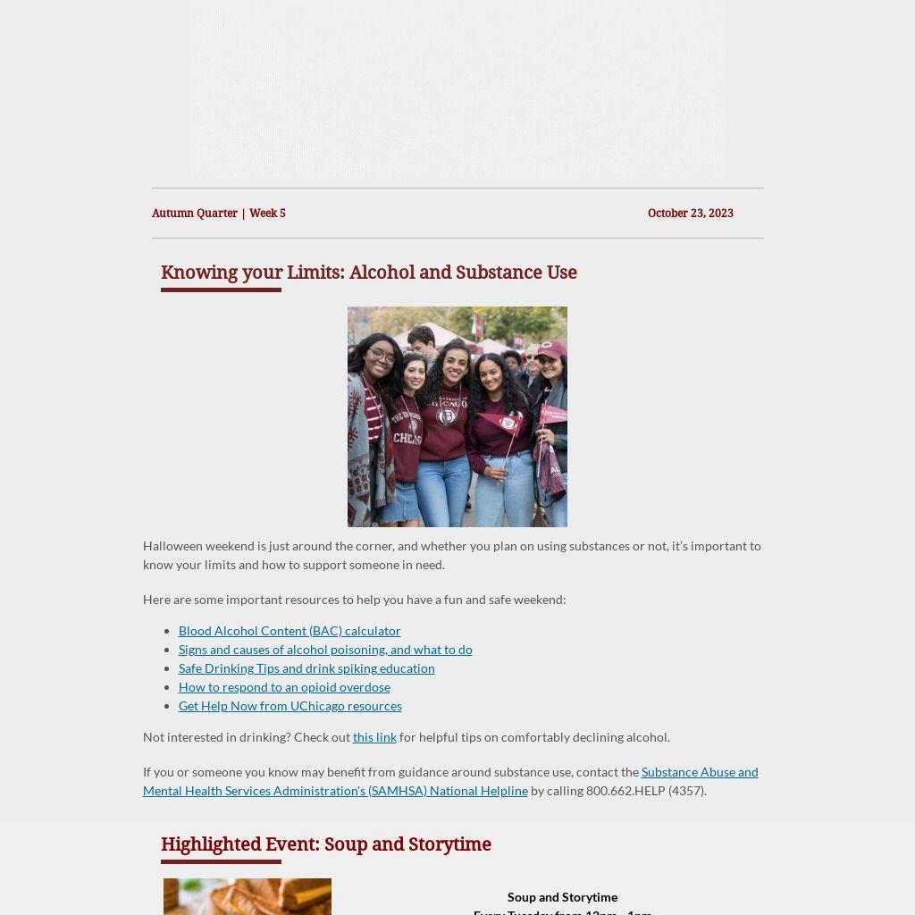 The mission of the University of Chicago Student Recovery Group is to provide fellowship and support for UChicago students who are exploring sobriety or in recovery from alcohol or other drugs. Student Recovery Group holds peer-to-peer discussion meetings to provide fellowship and community for students in recovery on Mondays from 6:00 PM - 7:00 PM at the Student Wellness Center (840 E. 59th St.). Please note there will be no meeting on November 20, 2023. You can also subscribe to our Student Recovery Listserv for updates and more information.