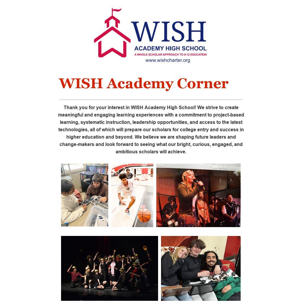 Thank you for your interest in WISH Academy High School! We strive to create meaningful and engaging learning experiences with a commitment to project-based learning, systematic instruction, leadership opportunities, and access to the latest technologies, all of which will prepare our scholars for college entry and success in higher education and beyond. We believe we are shaping future leaders and change-makers and look forward to seeing what our bright, curious, engaged, and ambitious scholars will achieve.