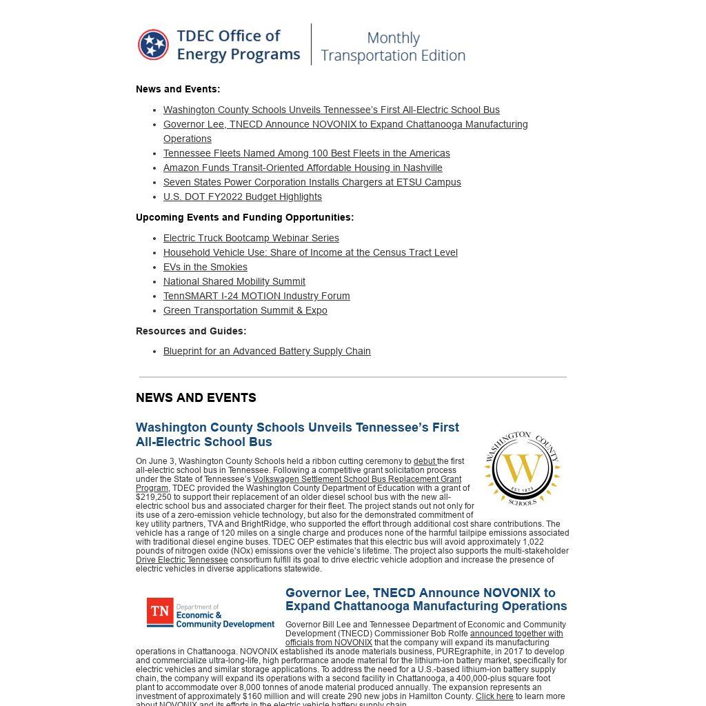 On June 3, Washington County Schools held a ribbon cutting ceremony to debut the first all-electric school bus in Tennessee. Following a competitive grant solicitation process under the State of Tennessee’s Volkswagen Settlement School Bus Replacement Grant Program, TDEC provided the Washington County Department of Education with a grant of $219,250 to support their replacement of an older diesel school bus with the new all-electric school bus and associated charger for their fleet. The project stands out not only for its use of a zero-emission vehicle technology, but also for the demonstrated commitment of key utility partners, TVA and BrightRidge, who supported the effort through additional cost share contributions. The vehicle has a range of 120 miles on a single charge and produces none of the harmful tailpipe emissions associated with traditional diesel engine buses. TDEC OEP estimates that this electric bus will avoid approximately 1,022 pounds of nitrogen oxide (NOx) emissions over the vehicle’s lifetime. The project also supports the multi-stakeholder Drive Electric Tennessee consortium fulfill its goal to drive electric vehicle adoption and increase the presence of electric vehicles in diverse applications statewide.