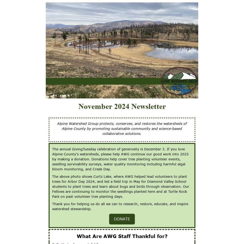 The annual GivingTuesday celebration of generosity is December 3. If you love Alpine County’s watersheds, please help AWG continue our good work into 2025 by making a donation. Donations help cover tree planting volunteer events, seedling survivability surveys, water quality monitoring including harmful algal bloom monitoring, and Creek Day.