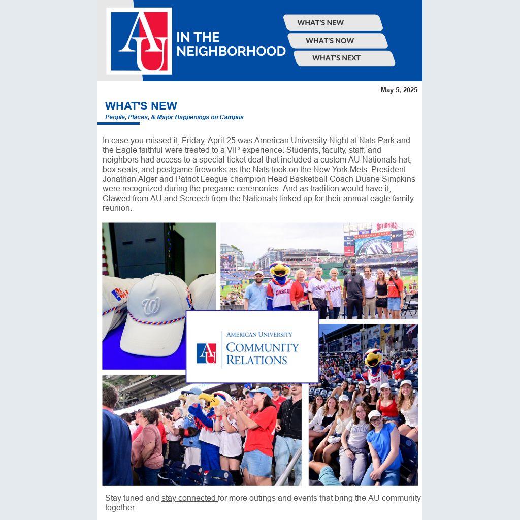 In case you missed it, Friday, April 25 was American University Night at Nats Park and the Eagle faithful were treated to a VIP experience. Students, faculty, staff, and neighbors had access to a special ticket deal that included a custom AU Nationals hat, box seats, and postgame fireworks as the Nats took on the New York Mets. President Jonathan Alger and Patriot League champion Head Basketball Coach Duane Simpkins were recognized during the pregame ceremonies. And as tradition would have it, Clawed from AU and Screech from the Nationals linked up for their annual eagle family reunion.