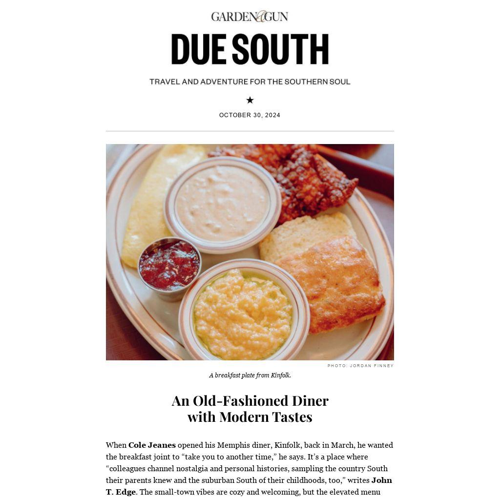 When Cole Jeanes opened his Memphis diner, Kinfolk, back in March, he wanted the breakfast joint to “take you to another time,” he says. It’s a place where “colleagues channel nostalgia and personal histories, sampling the country South their parents knew and the suburban South of their childhoods, too,” writes John T. Edge. The small-town vibes are cozy and welcoming, but the elevated menu goes beyond typical country kitchen fare (think perfectly creamy French omelets and grits topped with oyster mushrooms and chile-garlic crisp). Read on to see why this new morning spot is a must-visit on your next road trip through the area.