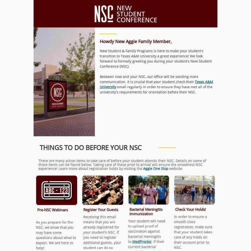 Between now and your NSC, our office will be sending more communication. It is crucial that your student check their Texas A&M University email regularly in order to ensure they have met all of the university's requirements for orientation before their NSC.