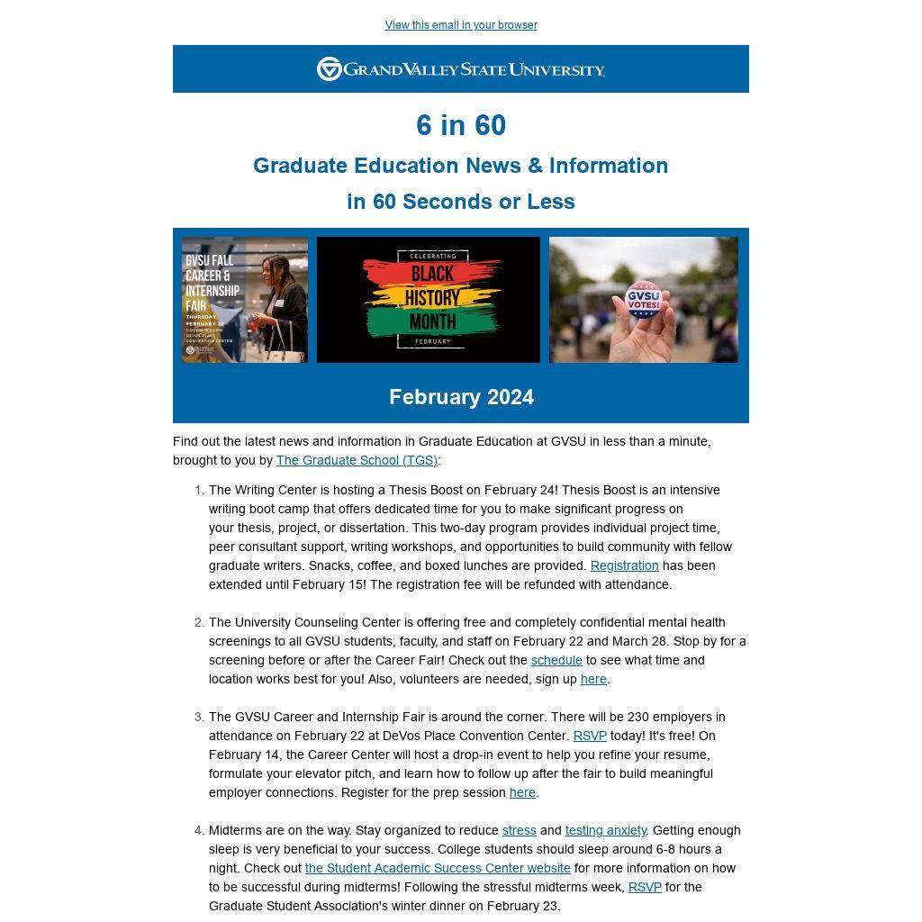 Find out the latest news and information in Graduate Education at GVSU in less than a minute, brought to you byThe Graduate School (TGS):