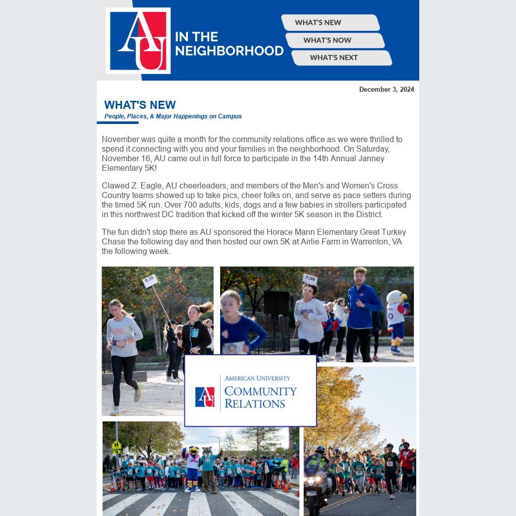 November was quite a month for the community relations office as we were thrilled to spend it connecting with you and your families in the neighborhood. On Saturday, November 16, AU came out in full force to participate in the 14th Annual Janney Elementary 5K!