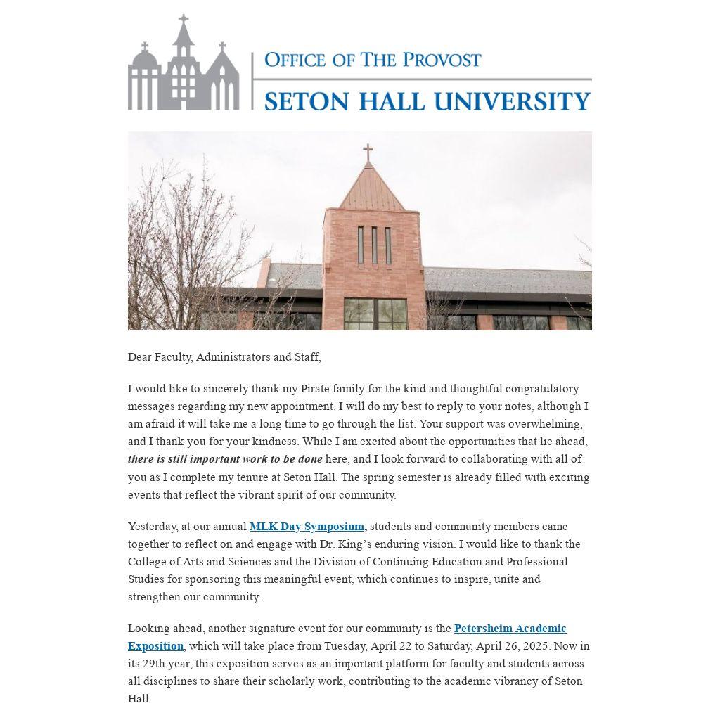I would like to sincerely thank my Pirate family for the kind and thoughtful congratulatory messages regarding my new appointment. I will do my best to reply to your notes, although I am afraid it will take me a long time to go through the list. Your support was overwhelming, and I thank you for your kindness. While I am excited about the opportunities that lie ahead, there is still important work to be done here, and I look forward to collaborating with all of you as I complete my tenure at Seton Hall. The spring semester is already filled with exciting events that reflect the vibrant spirit of our community.