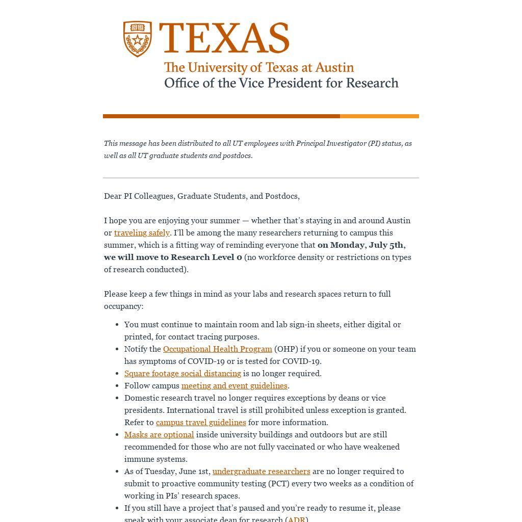 I hope you are enjoying your summer — whether that’s staying in and around Austin or traveling safely. I’ll be among the many researchers returning to campus this summer, which is a fitting way of reminding everyone that on Monday, July 5th, we will move to Research Level 0 (no workforce density or restrictions on types of research conducted).