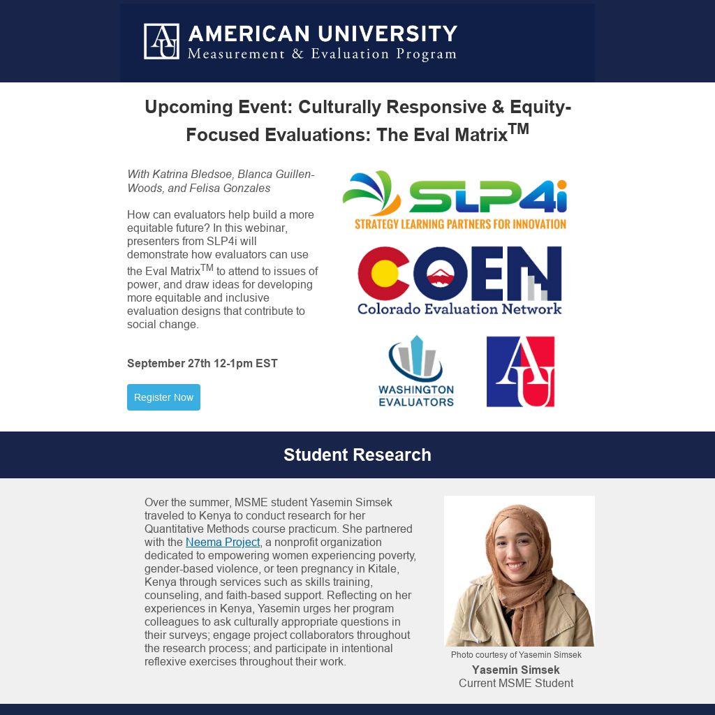 MSME and PME students and alumni spoke in several AU Measurement & Evaluation webinars, with hundreds of people from across the globe in attendance. |