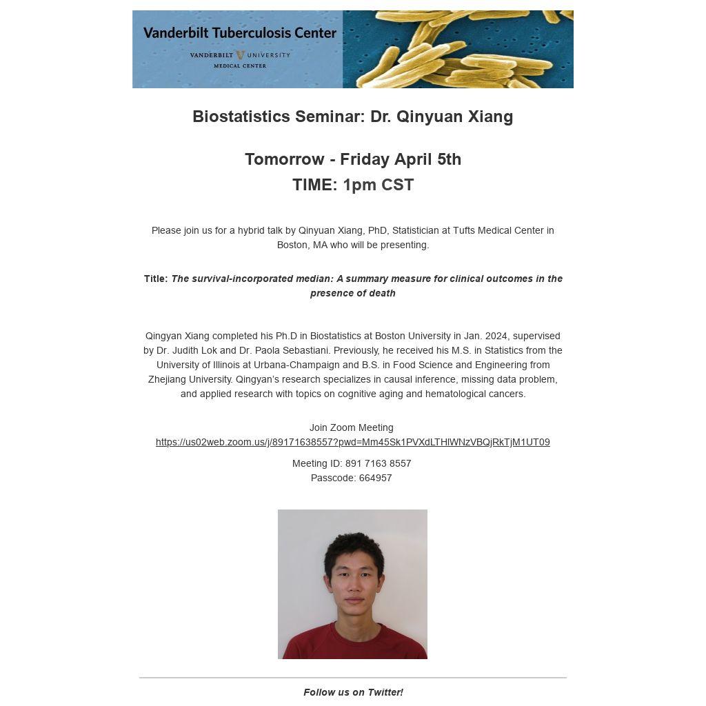Please join us for a hybrid talk by Qinyuan Xiang, PhD, Statistician at Tufts Medical Center in Boston, MA who will be presenting.