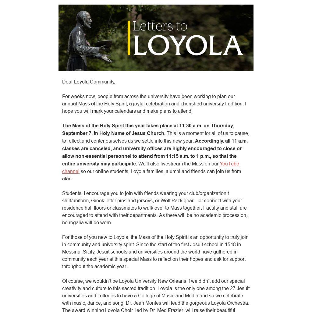 The Mass of the Holy Spirit this year takes place at 11:30 a.m. on Thursday, September 7, in Holy Name of Jesus Church. This is a moment for all of us to pause, to reflect and center ourselves as we settle into this new year. Accordingly, all 11 a.m. classes are canceled, and university offices are highly encouraged to close or allow non-essential personnel to attend from 11:15 a.m. to 1 p.m., so that the entire university may participate. We'll also livestream the Mass on our YouTube channel so our online students, Loyola families, alumni and friends can join us from afar.