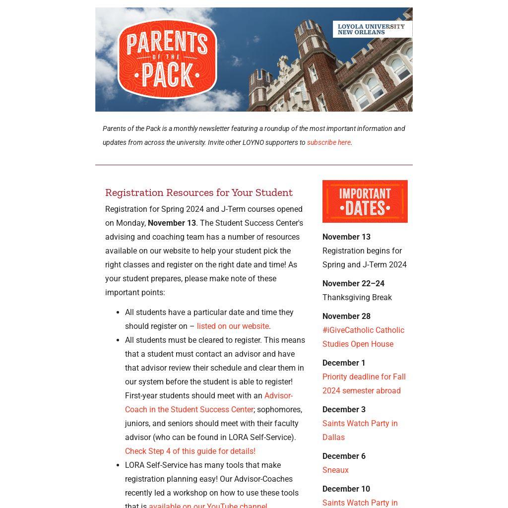 Parents of the Pack is a monthly newsletter featuring a roundup of the most important information and updates from across the university. Invite other LOYNO supporters to subscribe here.
