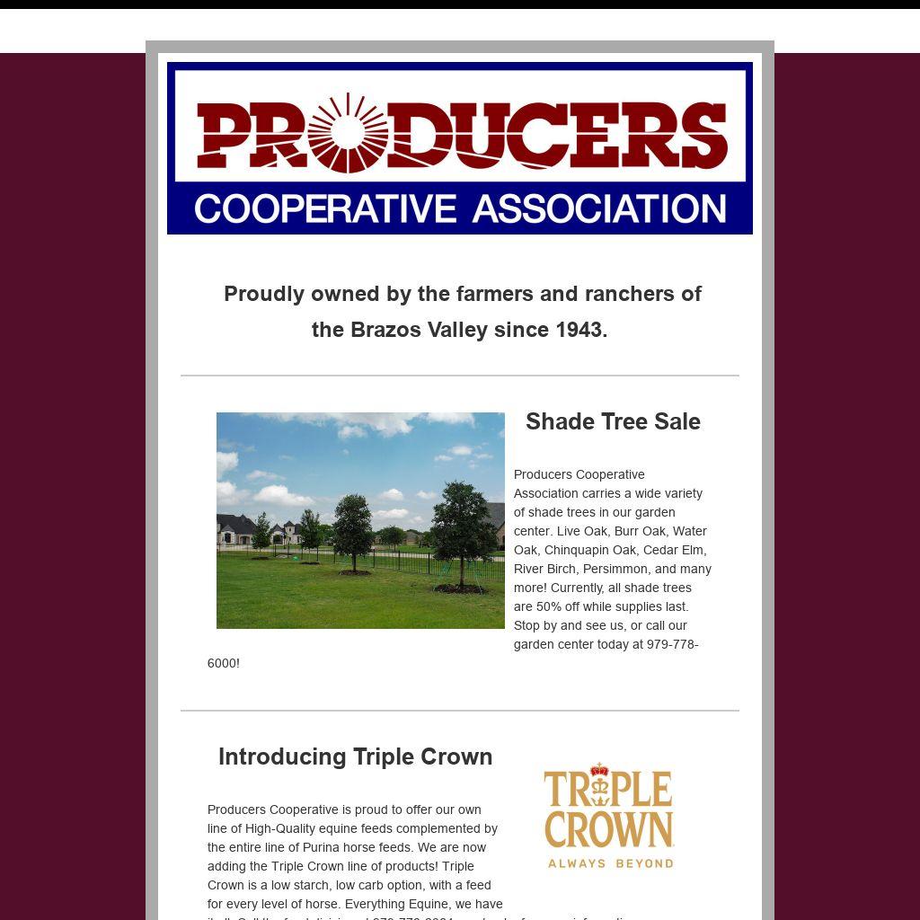 Producers Cooperative Association carries a wide variety of shade trees in our garden center. Live Oak, Burr Oak, Water Oak, Chinquapin Oak, Cedar Elm, River Birch, Persimmon, and many more! Currently, all shade trees are 50% off while supplies last. Stop by and see us, or call our garden center today at 979-778-6000!