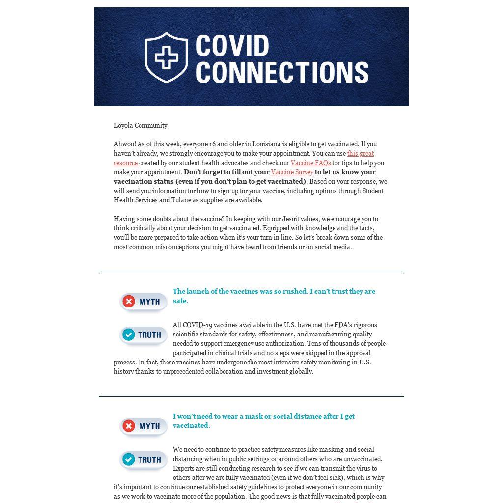 Don’t forget to fill out your Vaccine Survey to let us know your vaccination status (even if you don’t plan to get vaccinated). Based on your response, we will send you information for how to sign up for your vaccine, including options through Student Health Services and Tulane as supplies are available.