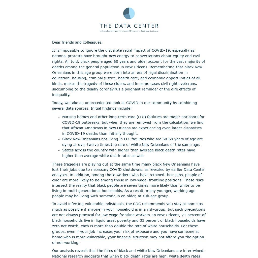 It is impossible to ignore the disparate racial impact of COVID-19, especially as national protests have brought new energy to conversations about equity and civil rights. All told, black people aged 60 years and older account for the vast majority of deaths among the general population in New Orleans. Remembering that black New Orleanians in this age group were born into an era of legal discrimination in education, housing, criminal justice, health care, and economic opportunities of all kinds, makes the tragedy of these elders, and in some cases civil rights veterans, succumbing to the deadly coronavirus a poignant reminder of the dire effects of inequality.