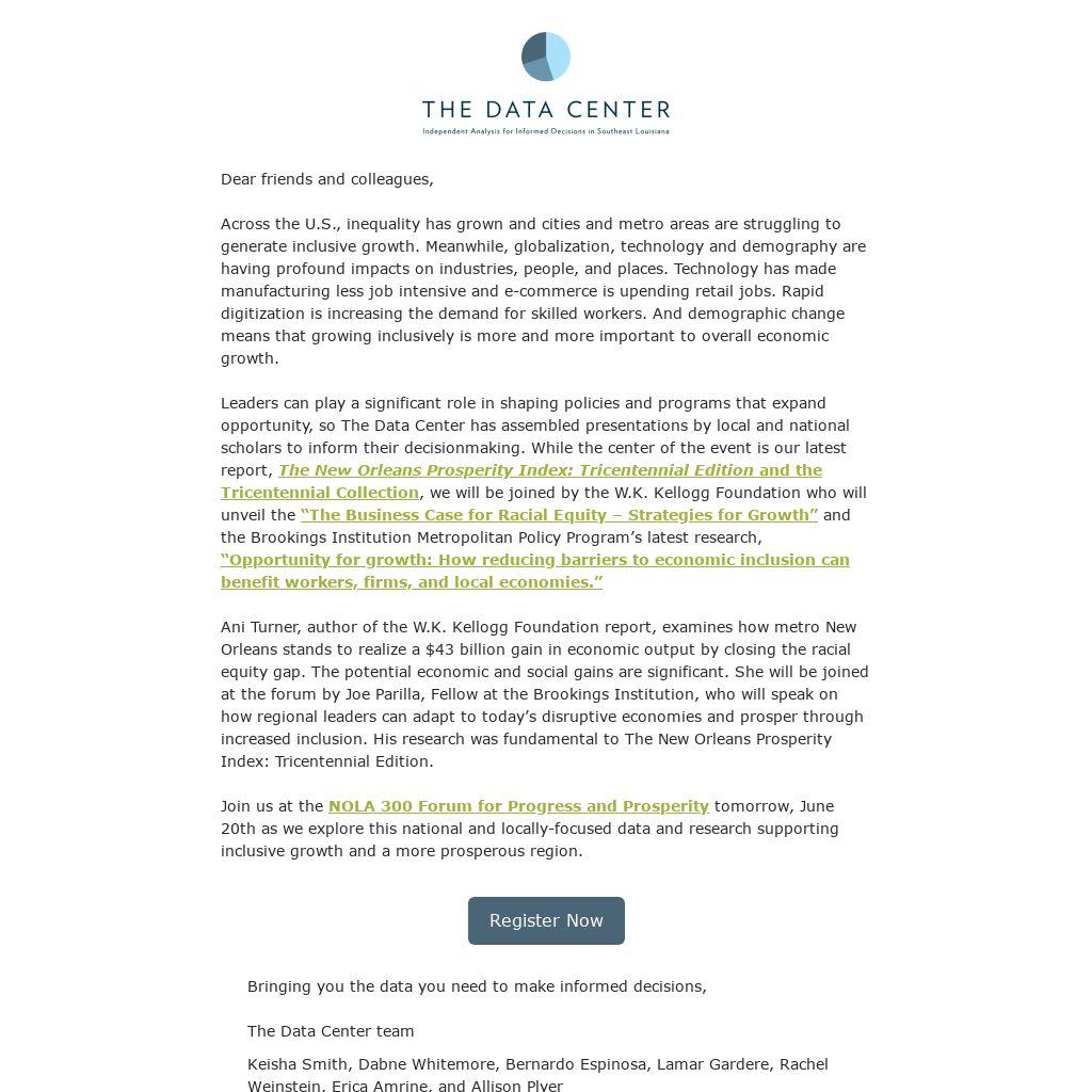 Join us at the NOLA 300 Forum for Progress and Prosperity tomorrow, June 20th as we explore this national and locally-focused data and research supporting inclusive growth and a more prosperous region.