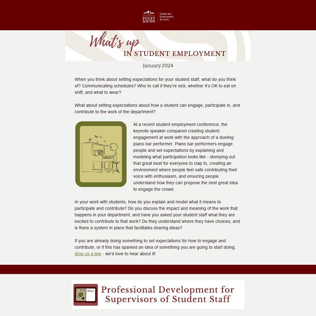 At a recent student employment conference, the keynote speaker compared creating student engagement at work with the approach of a dueling piano bar performer. Piano bar performers engage people and set expectations by explaining and modeling what participation looks like - stomping out that great beat for everyone to clap to, creating an environment where people feel safe contributing their voice with enthusiasm, and ensuring people understand how they can propose the next great idea to engage the crowd.