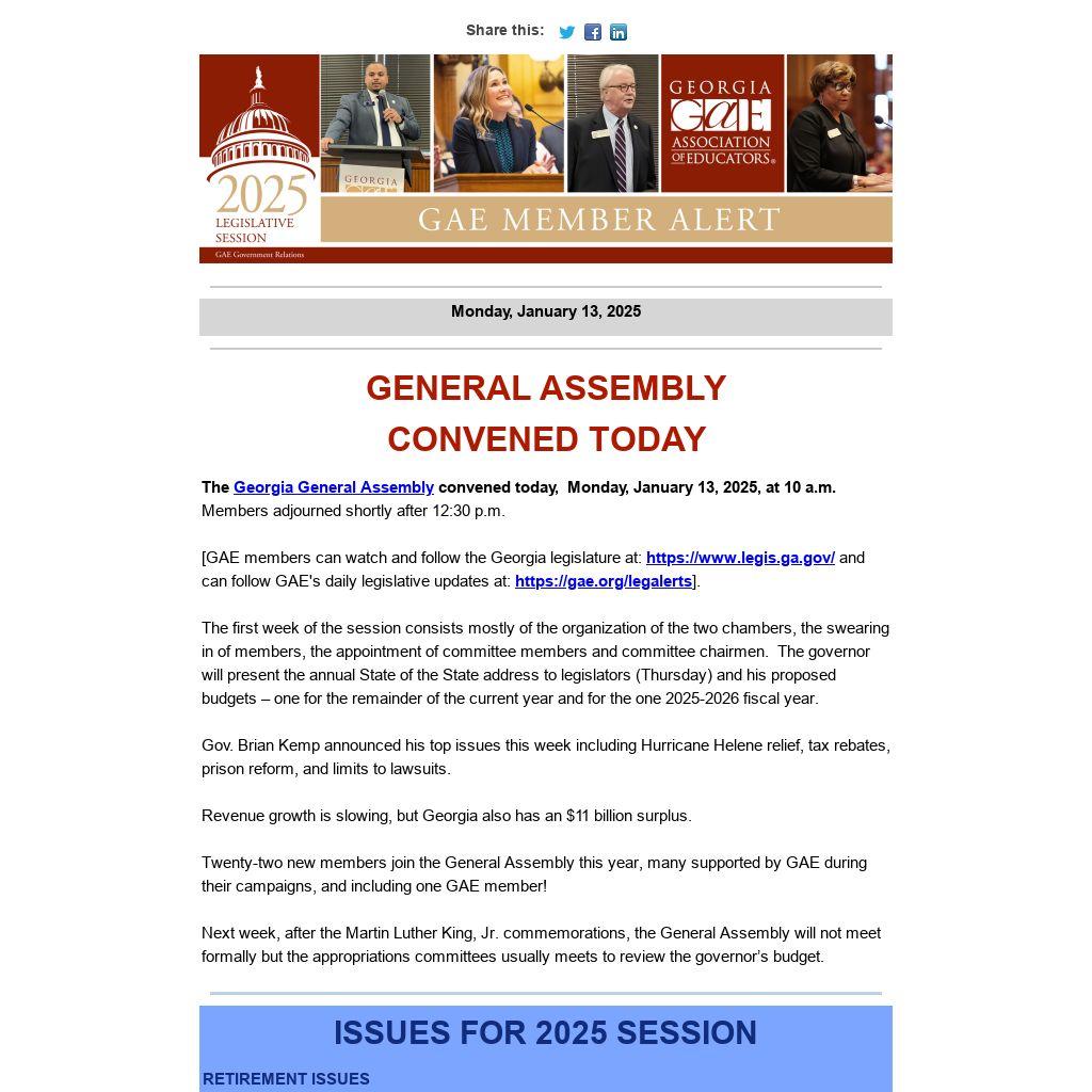 The Georgia General Assembly convened today, Monday, January 13, 2025, at 10 a.m. Members adjourned shortly after 12:30 p.m.