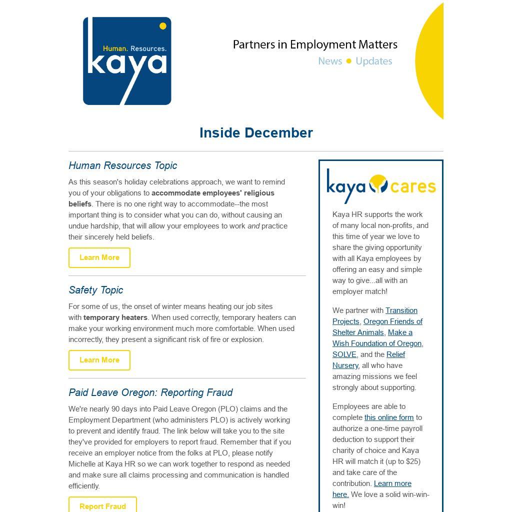 Paid Leave Oregon is new for all Oregon employers, but Kaya HR handles the PLO administration for all of our clients, so we've had a good amount of experience in just 90 days! We can answer questions for you or your employees, communicate with the folks at PLO, and a overall make the process as seamless as possible. Employer notices should be sent from the Employment Department directly to Kaya HR so if you receive one instead, please let us know!